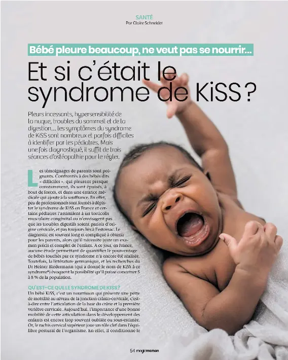 Syndrome De Kiss. Le syndrome de kiss consiste en un blocage complexe des cervicales c0 à c4, la leche league le décrit comme une cause de souffrance importante mais inconnue chez le bébé et ne s'améliore pas avec le temps car c'est un trouble de symétrie induits des vertèbres cervicales. C'est un troubles de symétrie induits des vertèbres cervicales. Près de 3000 bébés traités avec succès depuis 2011. Comment le détecter et le soigner ? D'ailleurs, beaucoup remettent en cause son existence. Le syndrome de kiss suscite la polémique. Très peu de professionnels de santé connaissent cette pathologie et sont en mesure de la diagnostiquer. Explications avec l'équipe du centre de consultation kiss. Ce n'est pas une maladie à proprement dit mais plutôt une perturbation fonctionnelle. Le syndrome de kiss est d'ailleurs souvent confondu avec le torticolis du nourrisson. Ce syndrome est un blocage de la jonction crânienne notamment de la première et seconde vertèbre cervicale (aussi appelés l'atlas et. Les kiss, ou kidd kinder, ont besoin d'un suivi ostéopathique très particulier. La posture de votre enfant, ses pleurs incessants ou encore ses maux inexpliqués peuvent vous alerter. Prenez rdv en ligne pour une consultation ! Nous pensons que seule une consultation avec des professionnels de santé, sensibilisés à la détection et au traitement de ce syndrome, permettra de vous confirmer ou non s'il s'agit d'un.